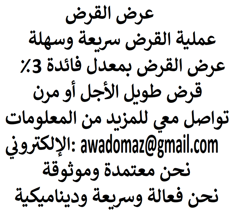 عرض القرض بنسبة 3 ٪ سنويا ، تقدم بطلبك الآن لمزيد من التفاصيل ..